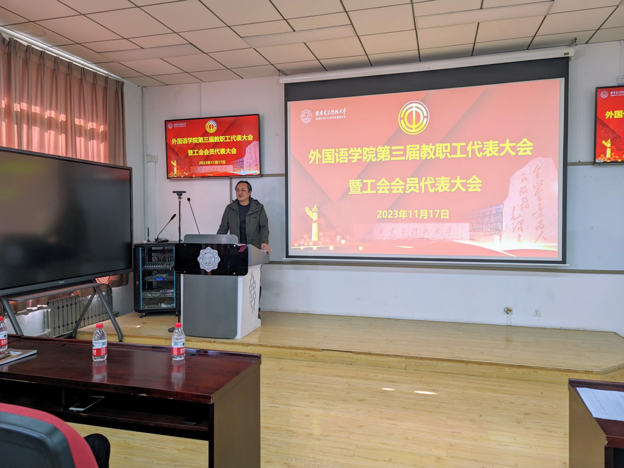 徐战利代表学院对当选人选表示祝贺,并希望各位“双代会”代表和工会委员认真履职,建言献策,积极为学院事业发展和教职工服务,进一步推进学院民主管理。最后,他向与会代表汇报了学院近几年在学科建设、人才培养、科研创新、国际交流、师资队伍等方面取得的成绩和进展。他号召全院教职工在未来的工作中,保持团结奋进传统,突出学院多语种特色,在文工交叉融合、教育教学、课程思政、国际交流、教育数字化等方面探索新的工作思路,努力打造适应时代发展的外语学科发展模式,为师生发展提供优质的资源与环境,凝心聚力、爱岗敬业,为学院的长足发展贡献自己的力量。