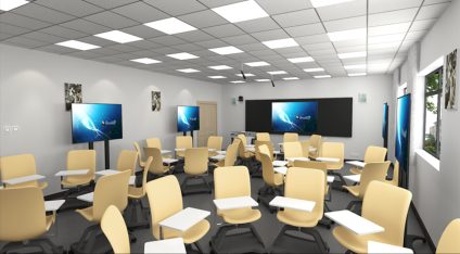 □分组研讨型——可活动、灵活分组桌椅,每组有独立显示屏,可供小组讨论及分享展示。任意切换显示的多屏互动,便于组间互动展示。