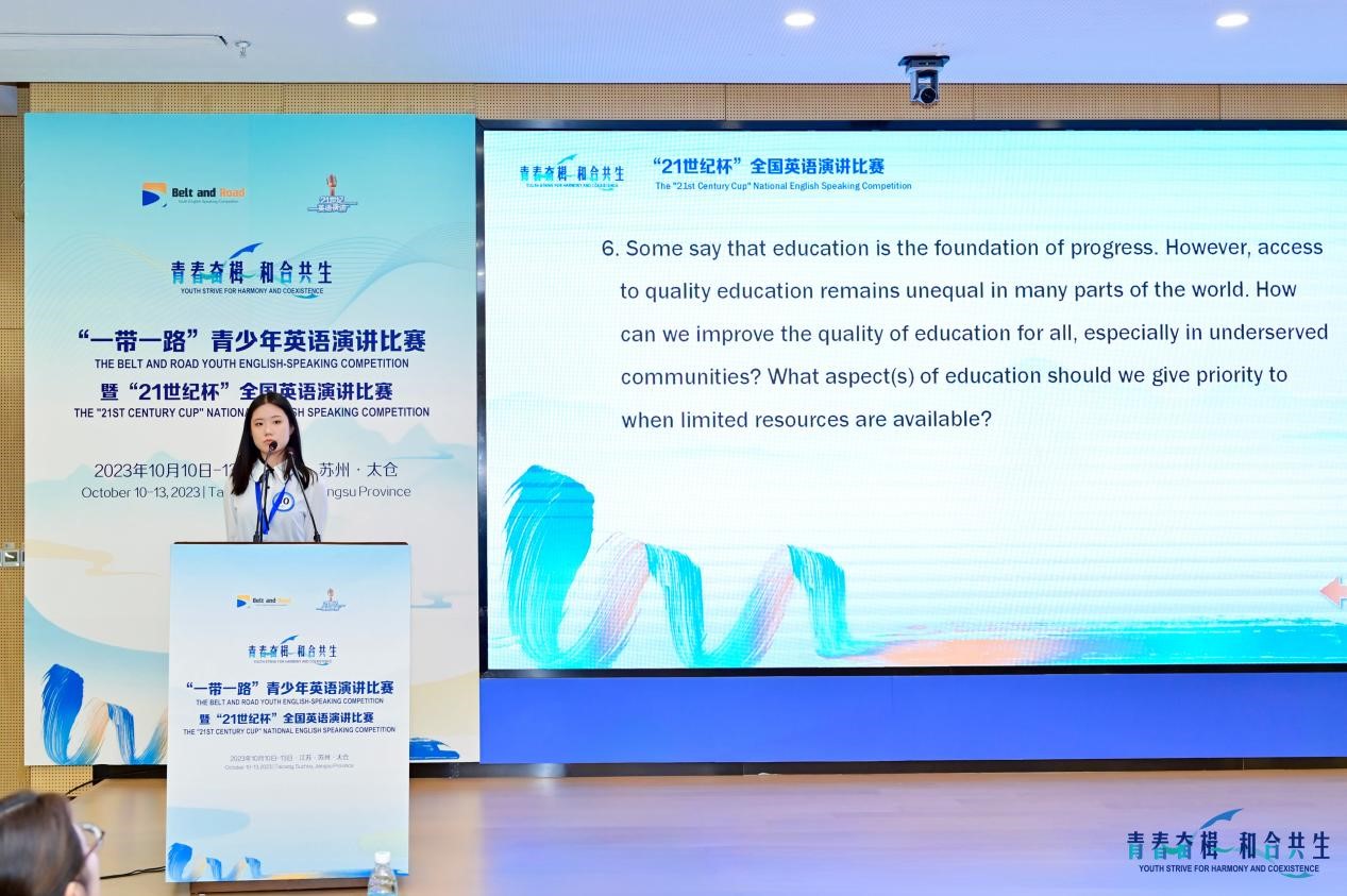 “21世纪杯”全国英语演讲比赛由中国日报社创办于1996年,旨在提高中国青年讲好中国故事的能力水平,为加强我国国际传播能力建设、促进文明交流互鉴、推动构建人类命运共同体凝聚青春力量。赛事于2023年3月入选“全国学科竞赛名单”,属于国家级A类学科竞赛。