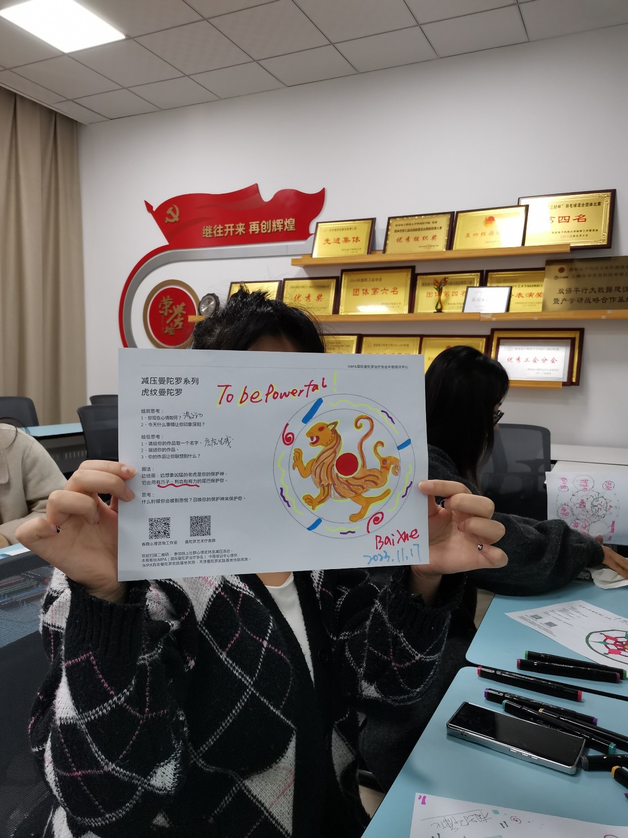 丁兰艳老师首先以压力为切入点,帮助团队正确认识了压力和压力源,并推荐大家在日常生活中通过手指操来放松情绪,缓解身心压力。丁兰艳老师引导大家写出人生中最重要的10样,并根据提示留下自己认为最重要的1样,帮助大家认识到人生中真正有价值的东西是什么。接着,同学们绘制了压力小球,共同分享自身压力来源,以及应对压力的方法。最后,大家进行了曼陀罗绘画,通过彩绘的形式引导大家探索内心,认识自我。活动中大家积极参与并互相交流分享感受,活动气氛活跃融洽。
