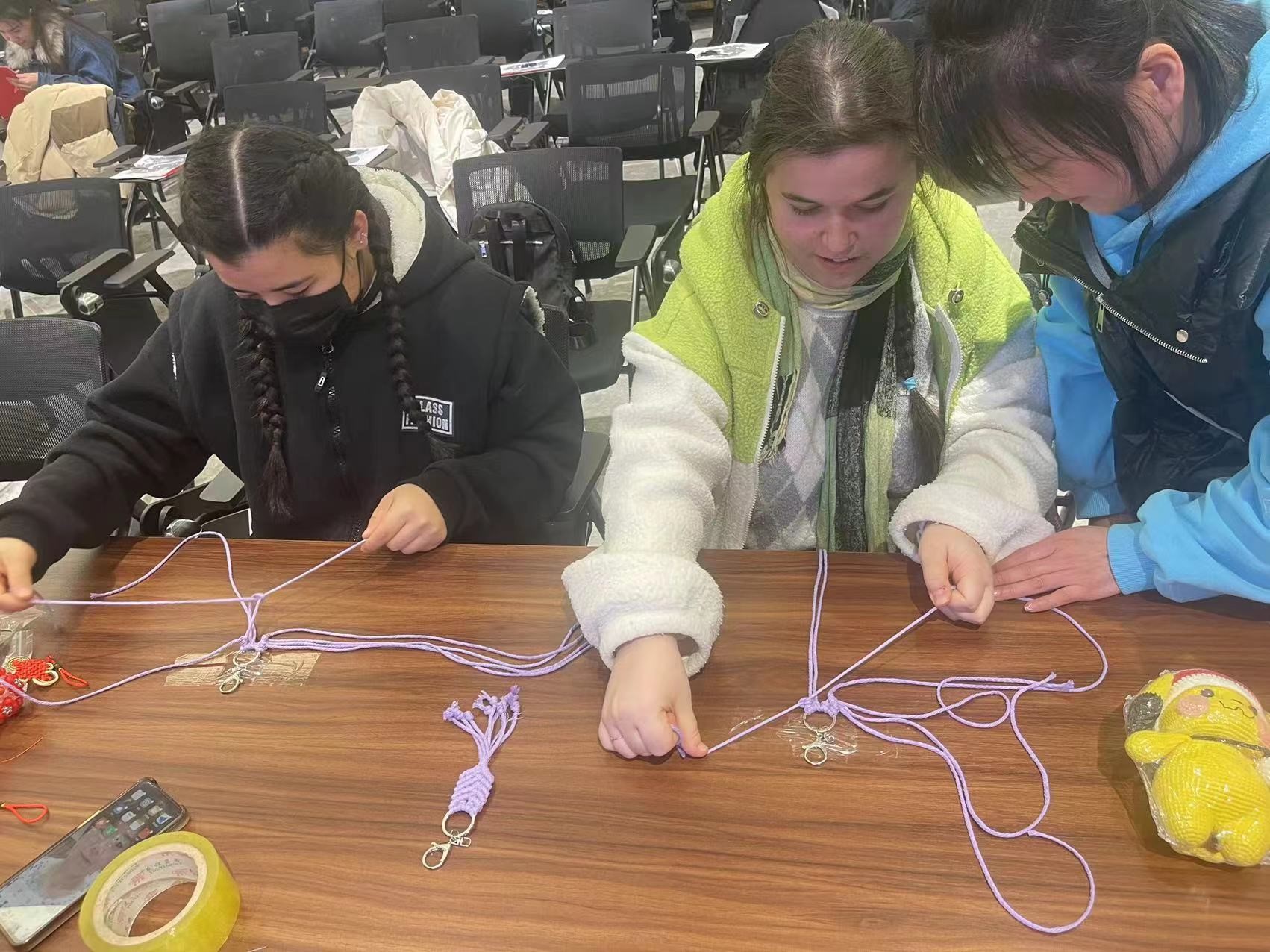 理论讲解结束后,两位专家走到同学们中间,带领大家亲自剪福龙、编挂坠。留学生们精神饱满,满怀热情。虽手法生涩,却难掩认真,经过精心折叠、剪刻,一幅幅包罗万象、栩栩如生的剪纸作品跃然眼前。一位来自土库曼斯坦的学生表示:“中国剪纸技艺太神奇了。这是我第一次体验剪纸、编织,希望今后能参加更多这类文化活动,更好地学习中国文化。”