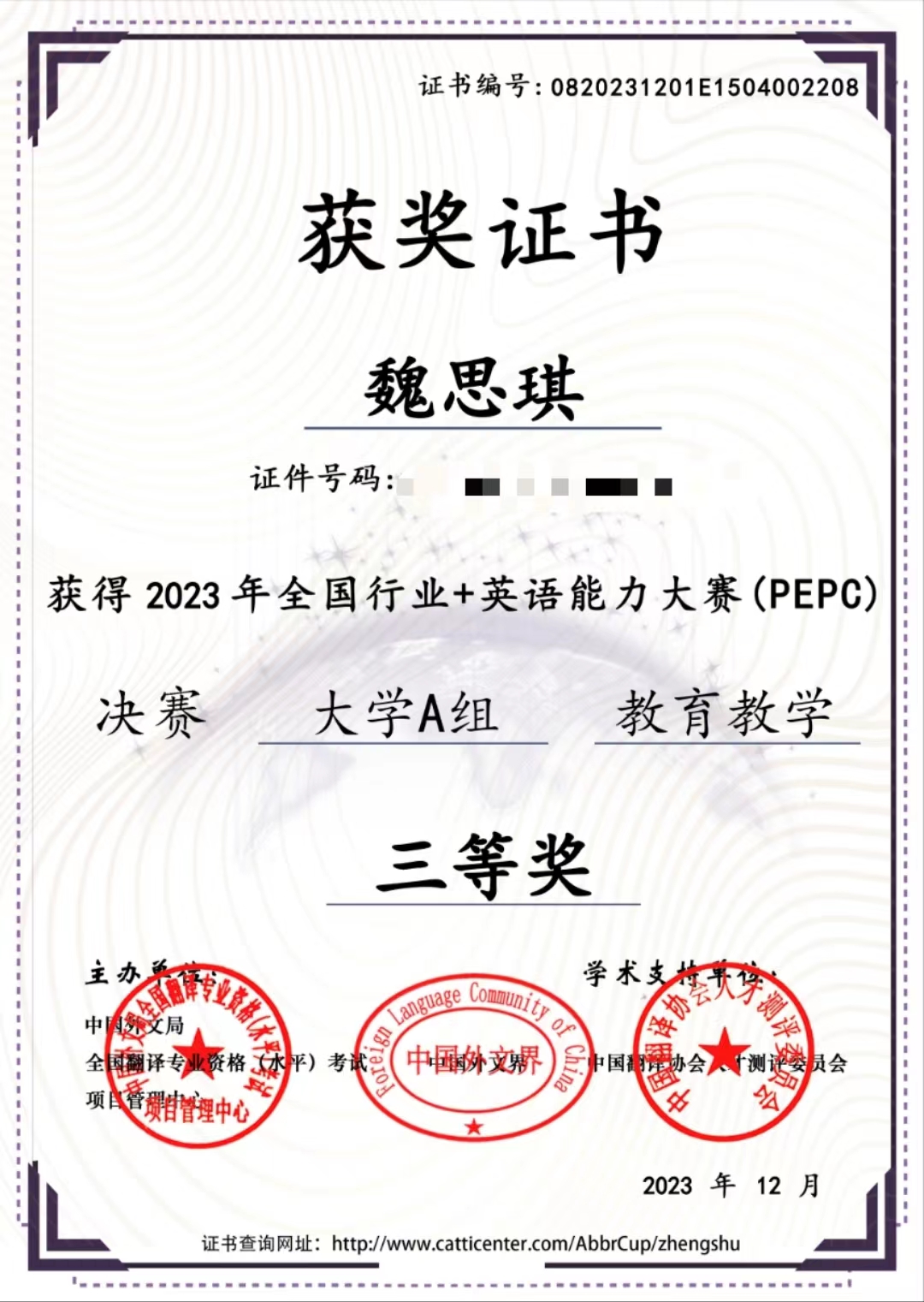(通讯员:朱琳菲)第二届全国行业+英语能力大赛(PEPC)于2023年12月17日落下帷幕,我校我院22级学生魏思琪从全国各省市自治区众多参赛选手中脱颖而出,在全国总决赛中排名前30%,获得大学A组(国内外高校外语专业在读学生)教育教学赛道决赛三等奖,指导教师刘一鸣荣获决赛优秀指导教师称号。