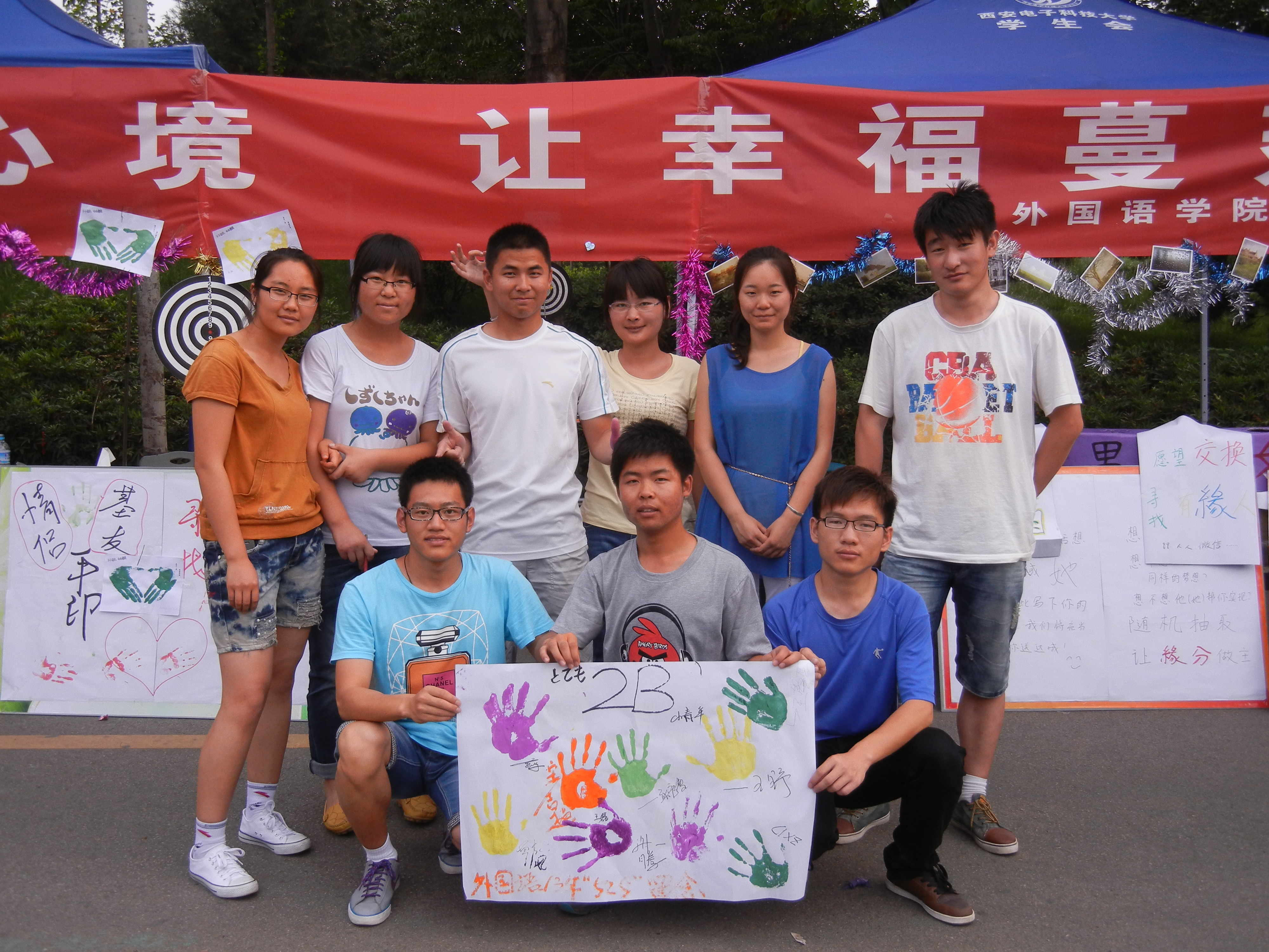 活动现场分为情感专区和休闲专区,主要包括:情侣手印,寻找有缘人,愤怒的飞镖等五个活动。在情感专区,前来参加“心形手印”见证爱情和友情的同学们纷纷用他们的手印留下了他们情感的印证,工作人员还将参与活动者印下的手印送给他们留作纪念,为他们留下美好的回忆;在寻找有缘人的活动中,同学们将自己的QQ号写在便利条上,投入与自己性别一致的密封盒子内,并同时在与自己性别不同的盒子内取出一张写有异性QQ号的便利条,这个活动的目的是为西电单身男女寻找“有缘人”。等候参与活动的同学们在活动场地外排起了长长的队伍,在工作人员的协调下,活动井然有序地进行,每个参与过活动的同学都面带微笑,身心得到了放松。