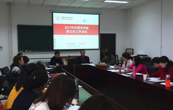 他希望,全体班主任、辅导员要根据学校学院的工作安排,结合各班实际积极开展学风建设活动,重点发挥班主任在学风建设中的作用,特别指出要将“四个一”计划要落到实处,要求每位班主任老师每学期指导学生“读一本外文名著,观看一部外文电影,组织一次学术活动,排练一个外文节目”,他希望每位班主任老师都能将“四个一”计划作为自己工作的抓手,认真负责落实好班主任工作,并对13级毕业班学生的就业情况,向毕业班班主任老师提出要求,希望班主任老师能帮助引导学生合理定位,设定适合学生本人的就业目标。最后他对班主任推动学院学生工作做出的贡献给予肯定,并表示感谢,对工作成绩突出的班主任老师提出表扬,希望班主任老师能继续保持饱满精神状态,发扬优良工作作风,加强与学生的沟通联系,认真努力做好班主任工作。