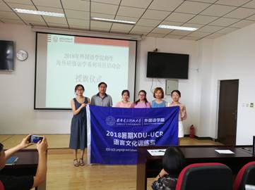 最后,学院领导分别给参加暑期海外研修的各个团队授团旗。 翻译系主任仝文宁、大英一部副主任辛冀秋、日语系王金博老师以及刚刚结束了在美国密苏里西部州立大学一年交换学习的15级翻译系王心怡同学与大家分享了各自海外学习的经历和感悟,并对即将赴海外研修的师生们提供了很多好的建议。