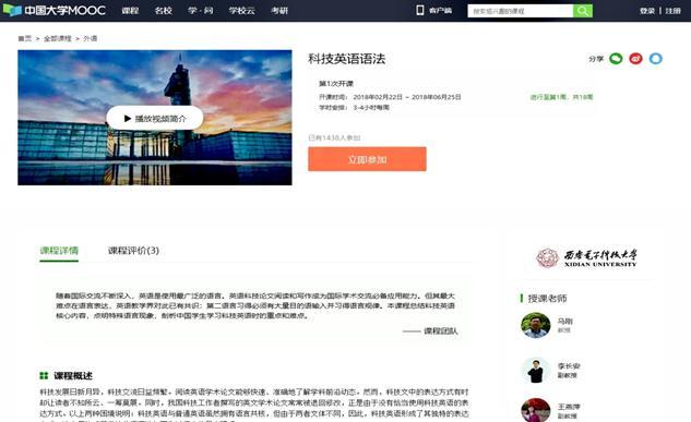 科技英语语法慕课课程以2015年校级科技英语在线开放课程为基础,在本科教育质量提升计划资助下,历经两年建设和西电学堂运行,2017年9月顺利结题,获得评审专家好评,以“优秀”成绩受学校推荐至中国大学MOOC平台(https://www.icourse163.org/)。此后,在慕课课程负责人、best365官网登录入口副院长马刚教授和课程建设运营主管李长安副教授的规划带领下,主讲教师王燕萍、曹志宏、仝文宁、周正履、任利华、张鹏华、孙玲玲、张明、马琪、朱琳菲等团队成员拼搏进取,攻坚克难,经过半年时间辛勤建设,完成课程框架构建、视频资源建设、资料采集录入等一系列工作,于2018年2月顺利通过中国大学MOOC平台审核成功登陆,移动学习平台“中国大学慕课”APP同步上线运行。“科技英语语法”慕课课程授课持续11周,涵盖科技英语语法核心内容,点明特殊语言现象,剖析中国学生及科技人员学习或应用科技英语时的重点和难点,以期提高学习者科技英语应用能力,适应日新月异的科技发展,便于日益频繁的科技交流。上线运行三轮次,选课学员近20000人,课程效果显著,得到学员认可。