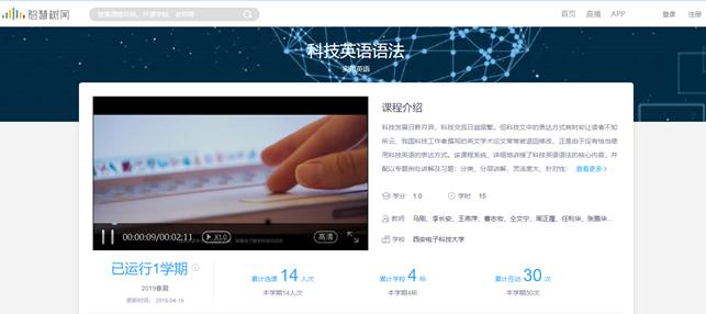 科技英语语法课程继上线中国大学MOOC平台后,又于2019年3月上线中国高校外语慕课平台(http://moocs.unipus.cn/),成为我校唯一一门在该平台应用的课程,2019年4月上线中国大学专业共享联盟(http://www.zhihuishu.com/)平台,此平台我校课程共7门。