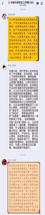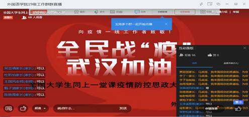 短暂休息后,同学们对所看课程进行了交流。武钰旻同学申请连麦发言道:“观看了这节课我感触真的很大,在疫情防控工作中,我们的社会主义优越性毋庸置疑,党员干部的先进性愈发突出。中国人民,中国态度,再一次证明了它的正确性!”在后面的连麦发言中,朱皓然同学说道:“路虽远,行则将至。事虽难,做则必成。抗疫情,众志成城。相信中国人民,一定会跨过这道坎。当枝头花儿开放的时候,一切都将是新的美好的开始。中国加油!我们一定能够胜利!”张稀歧同学说:“这次疫情告诉了我们什么呢?我觉得最重要的就是多难兴邦。这次疫情。真切地体现了中国共产党领导的优势,以及中国特色社会主义制度的优势也体现了中国自古以来的传统美德一方有难八方支援。我们应该做到拥护中国共产党。零零后这一代并不是颓废的一代。他们在祖国最需要的时候依然站在了前线。所以我对祖国的未来充满信心!”