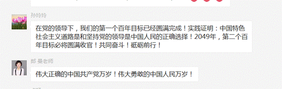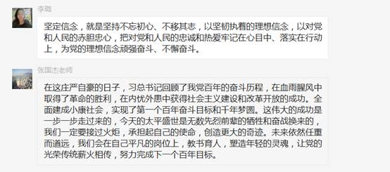 教师党员们在观看庆祝大会后都感动自豪,纷纷发言。马刚留言:“百年恰是风华正茂!中国共产党团结带领中国人民在第二个百年奋斗征程中,正以不可阻挡、不可逆转的步伐迈向中华民族伟大复兴!“ 曹志宏表示:“有幸见证这一重大而庄严的伟大历史时刻!无比骄傲与自豪!百年大党 风华正茂,以史为鉴 开创未来,祝福我党百年华诞 永葆青春!不忘初心、砥砺前行,中华民族伟大复兴的中国梦一定能实现!”陈争峰祝福“同庆百年荣光,见证岁月辉煌!祝福伟大的党!祝福伟大的祖国!人民有信仰,国家有力量,民族有希望,目光所致皆华夏,五星闪耀皆信仰 !”其他党员们也留言祝福表示中国共产党百年历经磨难,成就辉煌!要继续弘扬我党的光荣传统,赓续红色血脉,牢记初心使命,坚定跟党走,为实现下一个百年新目标努力奋斗!