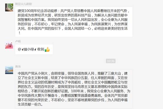 支部群内英语系同志们讨论热烈,心得和情感分享真挚而务实,本次建党百年庆祝活动的观摩让所有党员更加坚定拼搏向前的信念。“作为新时代的教师党员,我们将继续传承和发扬好中国共产党的光荣传统和优良作风,锐意进取、实干担当,为高质量推进教育现代化建设续写精彩篇章。 今天,最美的祝福送给党,送给祖国。”刘一鸣同志的这段分享正是代表了英语系党支部全体党员的心声。