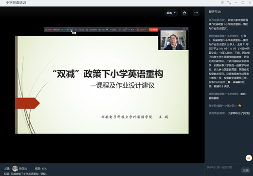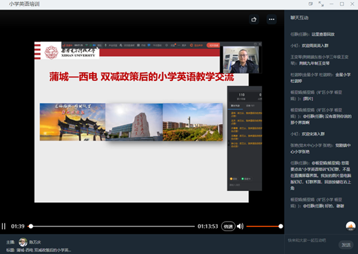 (通讯员:徐晔)11月12日上午,作为best365官网登录入口扶贫工作的有机组成,大英教学二部联合教学一部、蒲城县教育局教师中心、蒲城县祥塬小学在钉钉举行了线上外语教师交流会。针对“双减政策”出台后小学英语教学课堂设计和课后作业等环节出现的客观问题,两个教学部抽调部分骨干教师组成了支教服务小组,进行了细致的准备工作。交流会首先由大英二部主任陈万庆进行了题为《小学英语教学中的合作活动设计》的讲座,大英一部王娟老师进行了题为《双减政策下小学英语重构—课程与作业设计建议》的讲座。两位老师的分享获得了蒲城县参会教师们的一致好评,纷纷在留言区发表感想和收获。