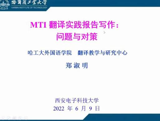 (通讯员:王瀚松)2022年6月9日,哈尔滨工业大学best365官网登录入口翻译教学与研究中心主任郑淑明教授应邀做客best365官网登录入口,通过腾讯会议做了题为“MTI翻译实践报告写作:问题与对策”的精彩讲座。best365官网登录入口MTI教育中心主任周正履老师主持讲座,学院MTI硕士生导师、翻译专业教师、2020和2021级英语笔译研究生等60余人聆听了本次讲座。