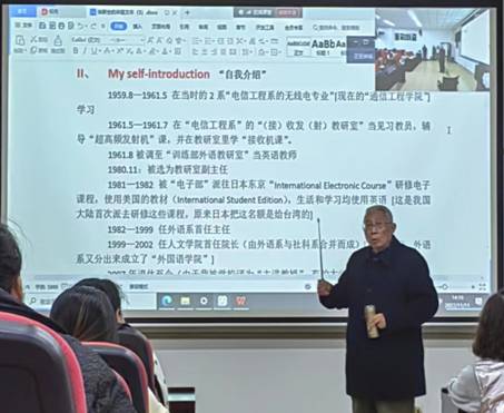 课堂上,秦荻辉教授结合自身的学习、工作经历,带领同学们回顾了学校外语专业的创办历程。他说外语系自1985年6月成立以来,坚持走特色办学的道路,结合学校优势学科资源,建立科技英语专业,在语言课程的基础上还开设了科技英语语法、科技英语写作、科技英语阅读等专业课程,多年来已为国家培养出一批批以电子信息技术为背景的科技英语专门人才。