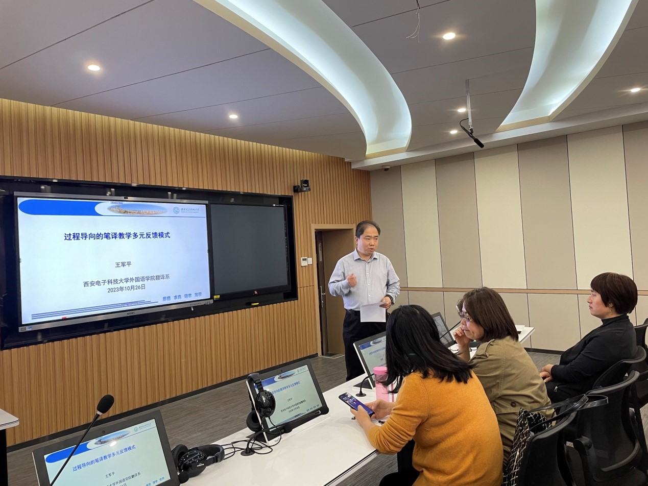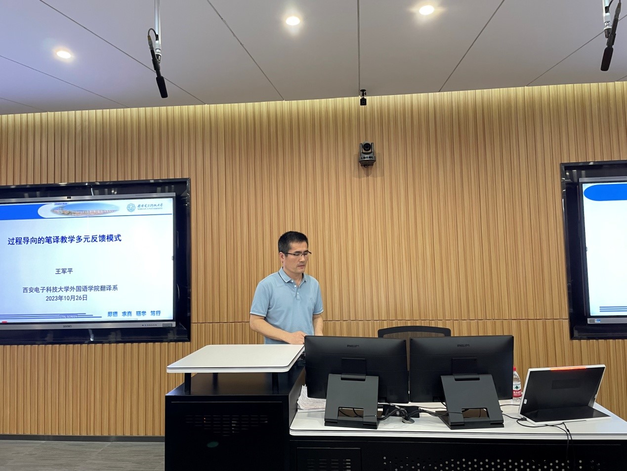 (通讯员:艾福旗) 10月26日下午2:00点,best365官网登录入口在信远II-502教室举办题为“过程导向的笔译教学多元反馈模式”的翻译教学公开课。此次翻译教学公开课为本科教育教学审核评估及best365官网登录入口成立十周年系列活动之一,翻译系教授王军平主讲,副院长李长安主持。