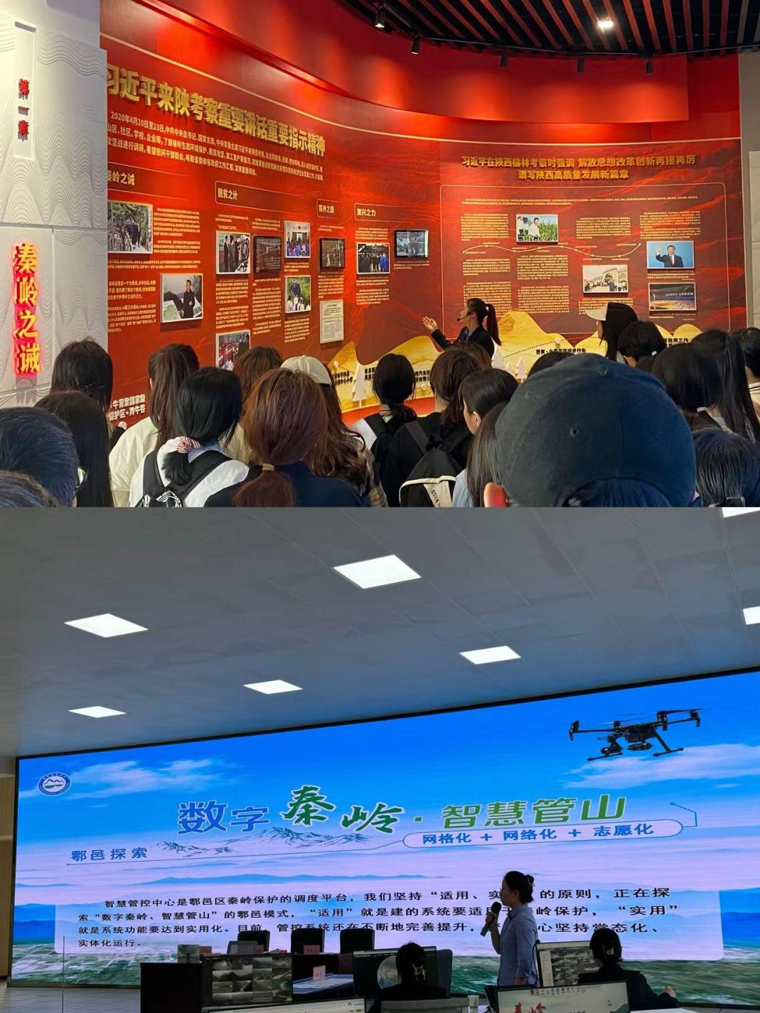 秦岭和合南北、泽被天下,是我国的中央水塔,是中华民族的祖脉和中华文化的重要象征。同学们在工作人员的带领下参观了秦岭保护“一站三中心”,这是落实习近平总书记来陕考察重要讲话精神、牢记大教训、保护大秦岭的总平台。通过学习“秦岭之诫”“秦岭之殇”“秦岭之治”“以案示警”“大美秦岭”五个版块内容,同学们重温习近平总书记来陕考察重要讲话重要指示精神,感受秦岭之美,牢记秦岭之诫。随后,工作人员为同学们演示了秦岭的视频监控系统和“五乱”自动识别监测系统,让同学们了解秦岭“智慧管山”建设方面的创新举措,拓展了科技力量助推家国发展的认知。