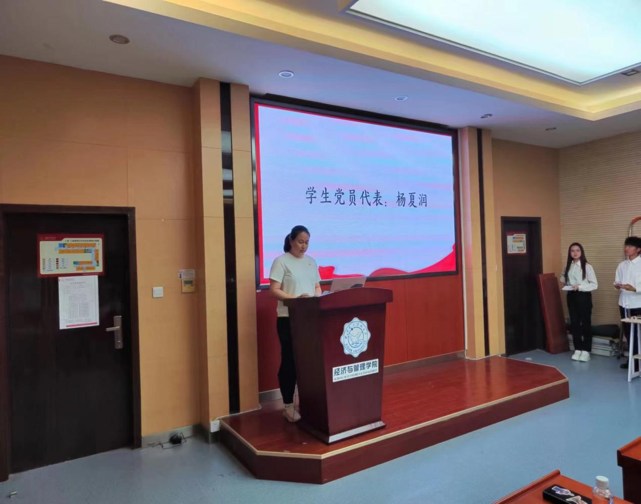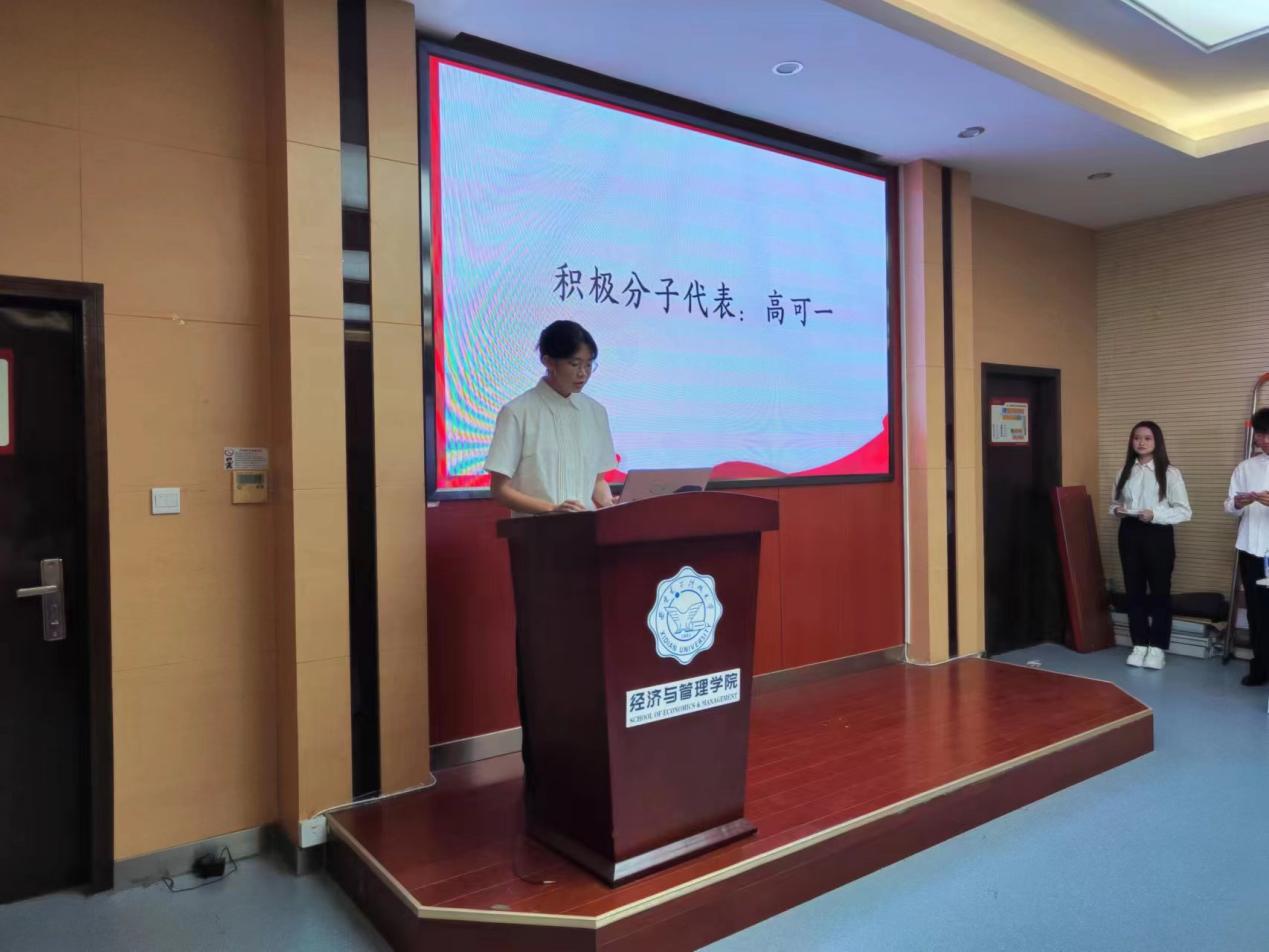 杨夏润同学、高可一同学分别代表学员发言。党员代表杨夏润同学说道:“作为动荡时代下成长在强大安全祖国的幸运儿的我们,更应该意识到肩负的使命和责任,努力成长为素质过硬的新青年,未来勇挑重担、报效祖国。”高可一说道:“作为入党积极分子,我们虽尚未成为真正的共产党员,但我们应始终以党员的标准来要求自己,积极带头做好榜样,用实际行动激励、鼓励身边的人。”