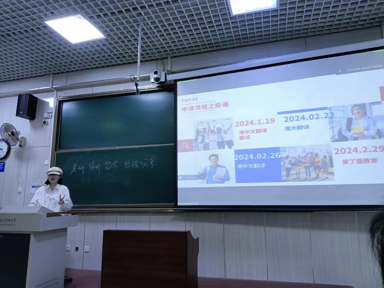 20级学姐李梦婵目前已成功获得香港中文大学翻译研究生的资格,她先讲解了授课型硕士和研究型硕士的不同点,帮助计划留学的同学进行未来方向的选择,然后从材料准备、流程安排、雅思学习等方面向同学们清晰地介绍了申请海外留学细节过程,最后就留学机构的选择为同学们提出了精准的建议,防止同学在准备过程中受骗。